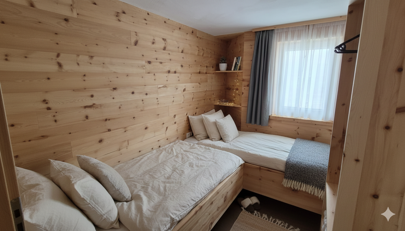 Zirbenholz ist seit jeher für seine besondere, wohltuende Wirkung bekannt: Der warme Duft, die natürliche Maserung und die ruhige Ausstrahlung schaffen eine Atmosphäre, in der man sofort entschleunigt. Die teilweise Zirben-Vollholzverkleidung im Schlafzimmer macht den Raum besonders behaglich und unterstützt ein angenehmes Raumklima – ideal zum Abschalten nach einem aktiven Tag in den Bergen und für erholsame Nächte.